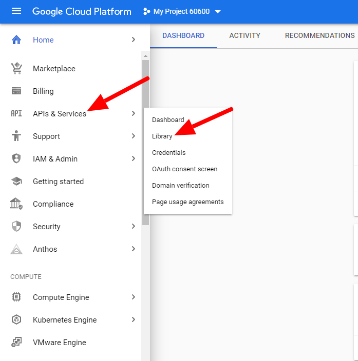- プロジェクトを作成するとプロジェクトのダッシュボードにリダイレクトされます。左側のメニューからAPIs & Services -> Libraryを開いてください。