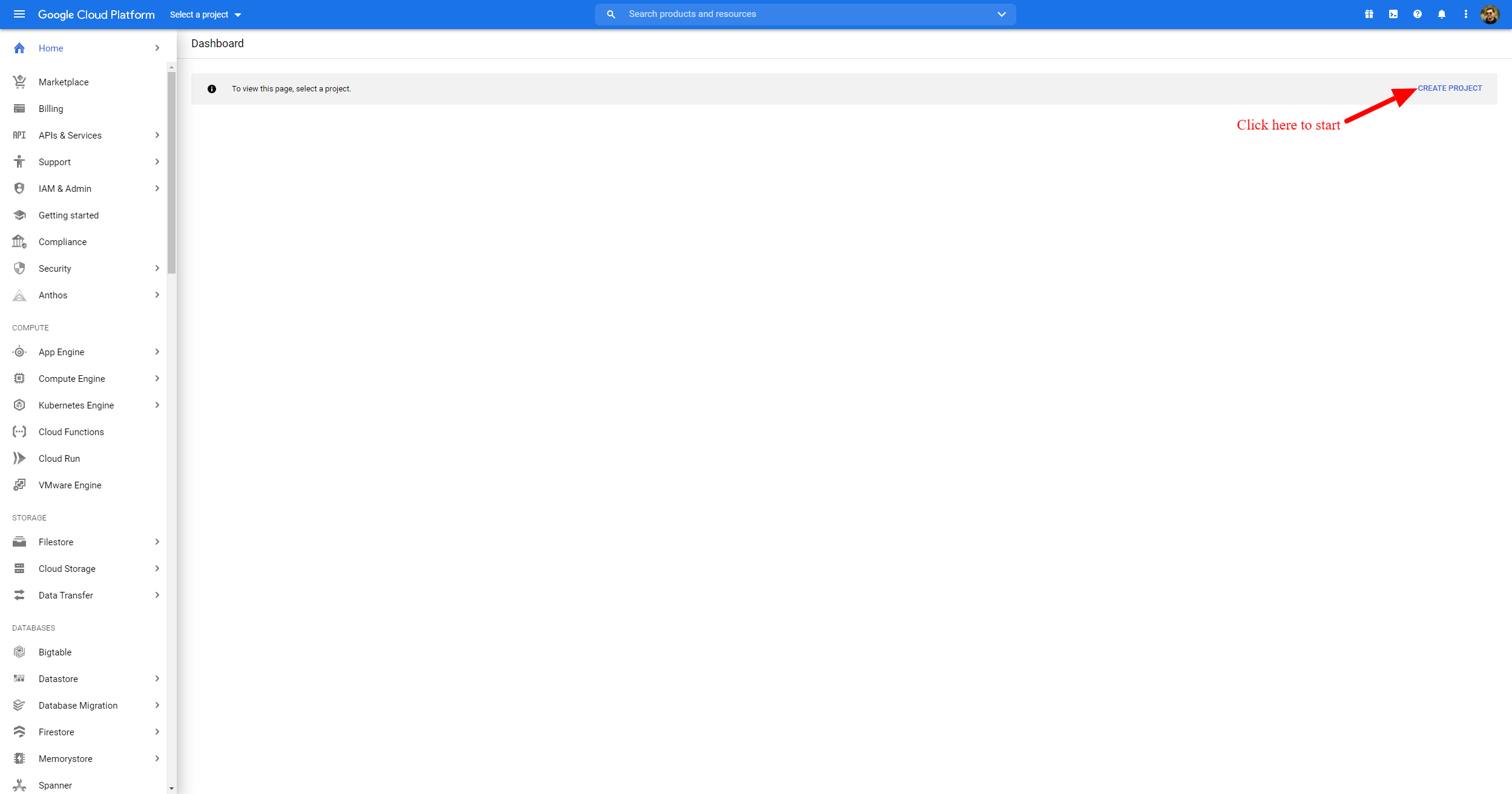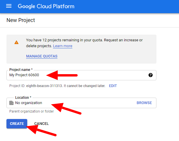 - Google Cloud Platformにリダイレクトされたら、まずプロジェクトを作成します。