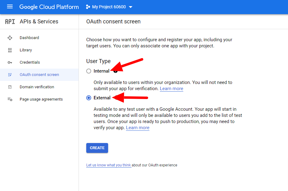 - OAuth consent screenでは2つのオプションが表示されます。