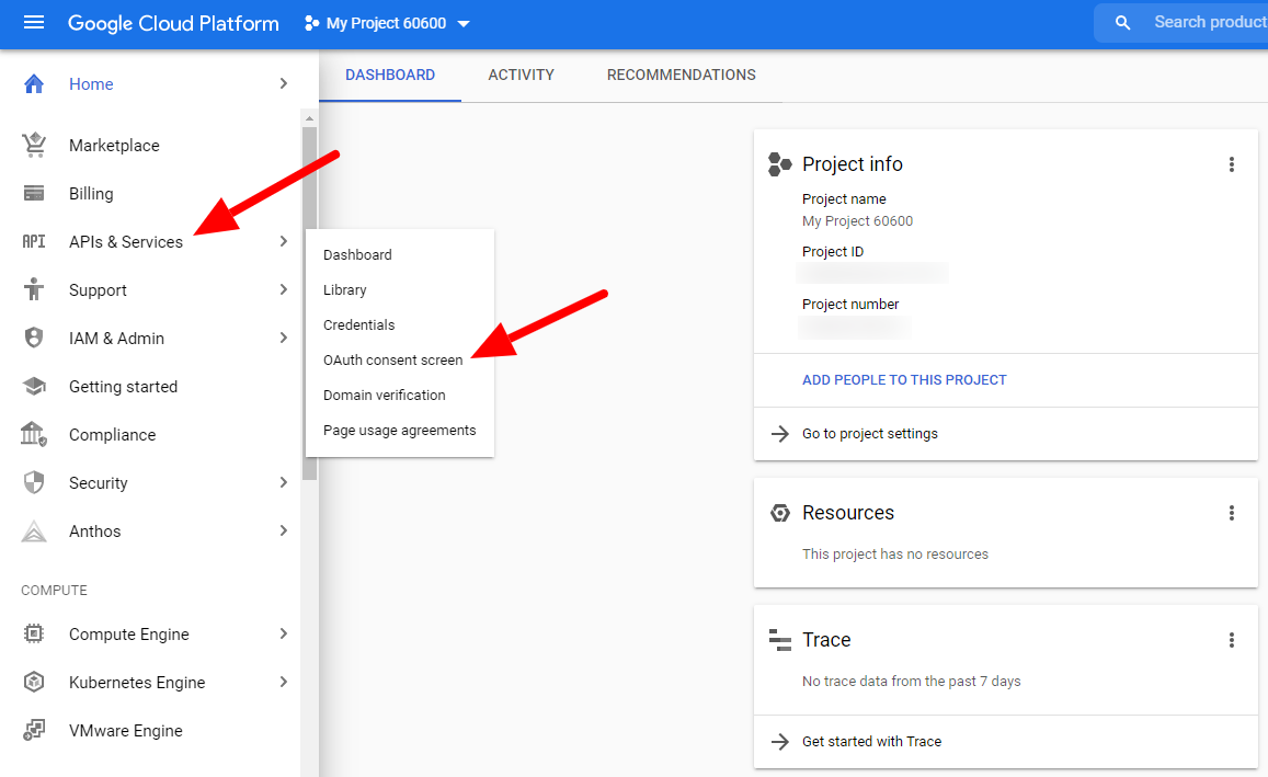 - 有効化したら、プロジェクトのダッシュボードに戻り、同じAPIs & Servicesセクション内にあるOAuth consent screenを開きます。