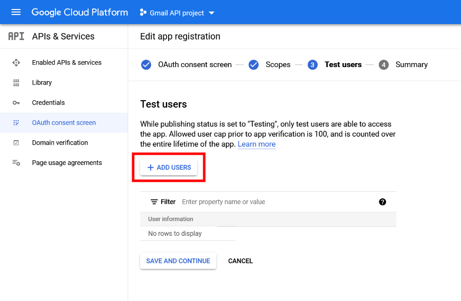 - ユーザーの追加が完了するとOAuth consent screenの設定は完了です。次にCredentials画面でOAuth Client IDを作成する必要があります。
