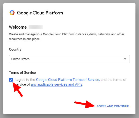 - まずhttps://console.cloud.google.com/にアクセスし、Googleアカウントでログインします。このページに初めてアクセスする場合、利用規約への同意が求められます。同意する場合はAGREE AND CONTINUEをクリックしてください。