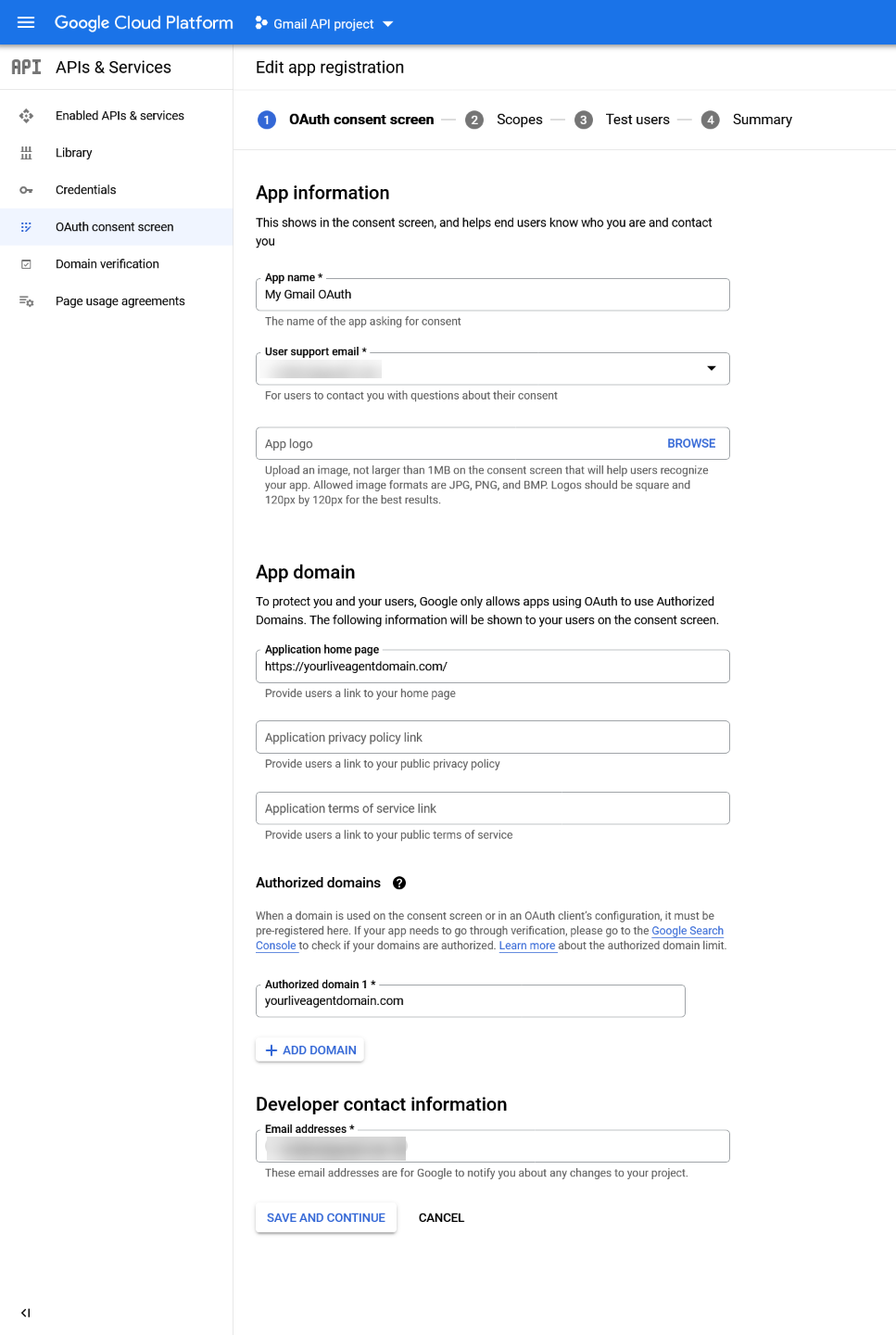 - OAuth consent screenの詳細情報を入力します。
