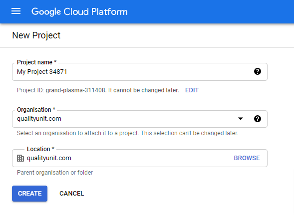 - 用途がわかるようにプロジェクト名を付けてください。GoogleアカウントがGoogle Workspace(旧G-suite)の組織に属している場合、プロジェクトは自動的にその組織の配下に作成されます。プロジェクトを配置するフォルダーまたは親組織を選択できます。