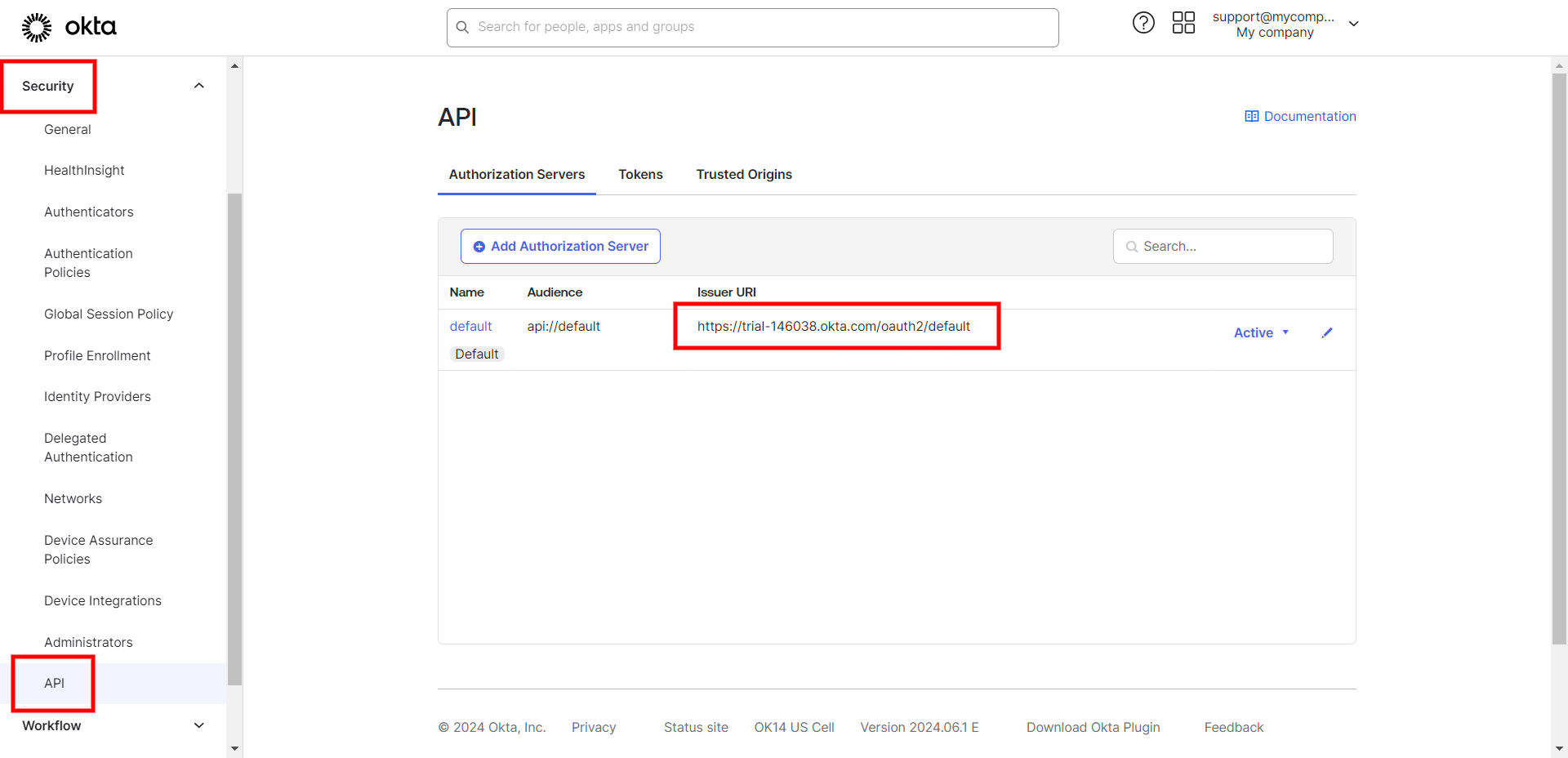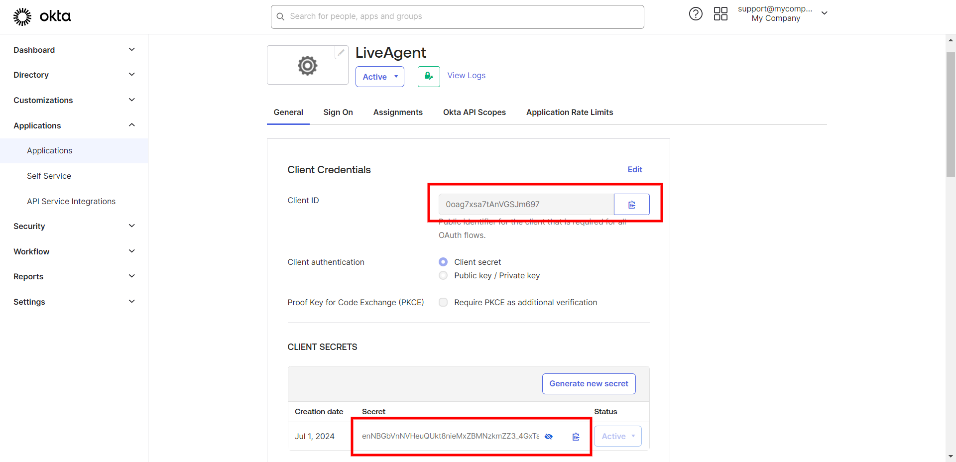 アプリを保存したら、クライアントIDとクライアントシークレットをコピーします。LiveAgentパネルに戻り、OktaインテグレーションのConfiguration(設定)フォームの対応するフィールドにクライアントIDとクライアントシークレットを貼り付けます。再びOkta管理パネルのSecurity(セキュリティ) > APIセクションに移動し、利用可能なIssuer URIのいずれかをOrganization URLとしてコピーし、LiveAgentの設定フォームに貼り付けます。