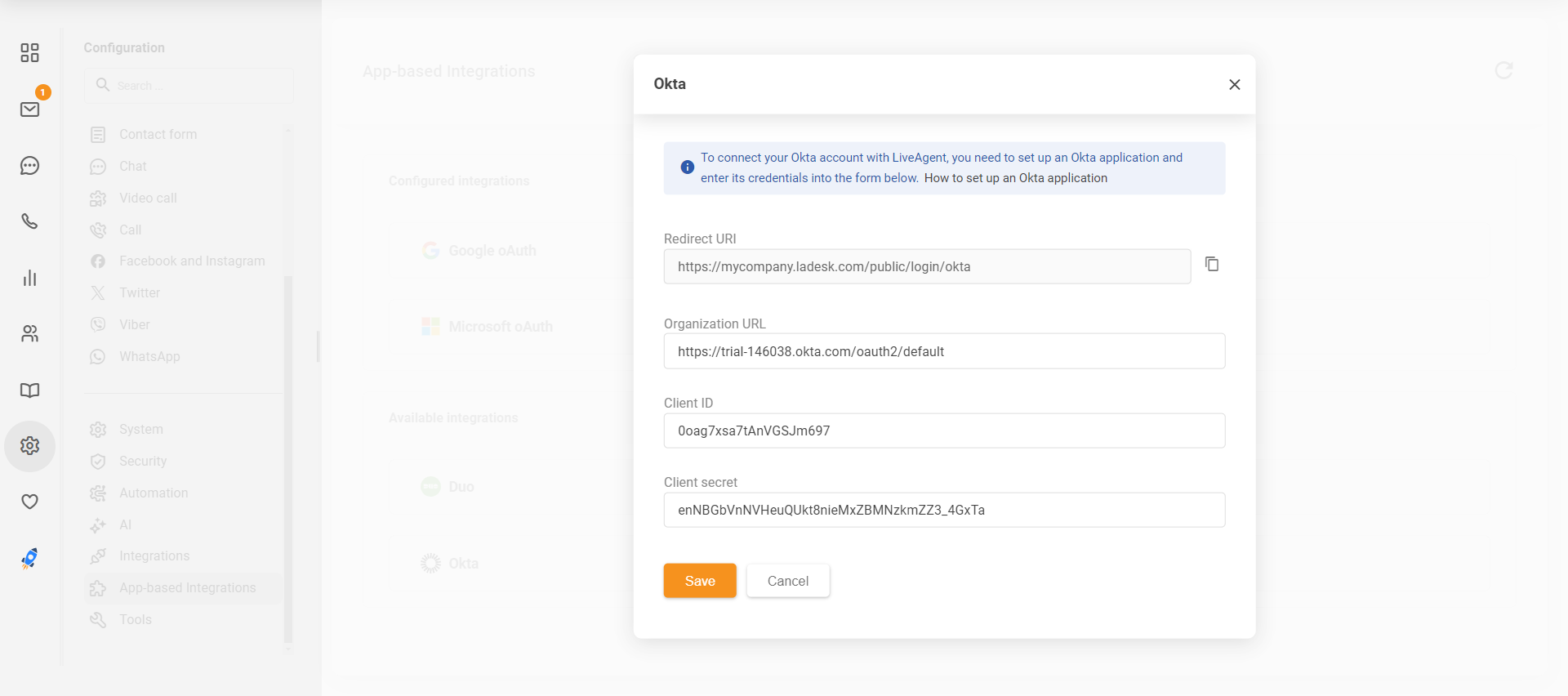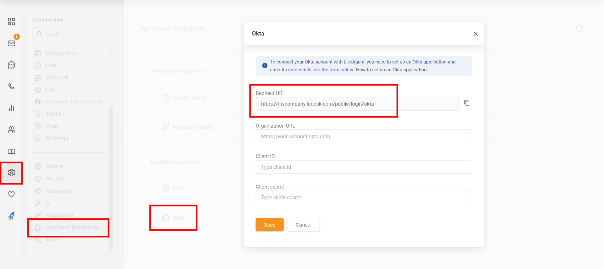 Okta管理パネルでの新しいアプリの設定を進める前に、LiveAgentアカウントにログインし、Configuration(設定) > App-based integrationsに移動して、Oktaインテグレーションをクリックしてセットアップします。設定ウィンドウからリダイレクトURIアドレスをコピーします。このアドレスはOktaアプリの設定で使用します。