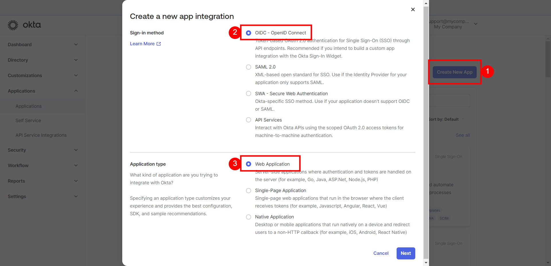 Applicationsセクションで「Create New App」ボタン(Applications > Applicationsから移動した場合は「Create App Integration」ボタン)をクリックします。新しいアプリインテグレーション画面で、サインイン方法として「OIDC - OpenID Connect」を選択し、アプリケーションタイプとして「Web application」を選択します。