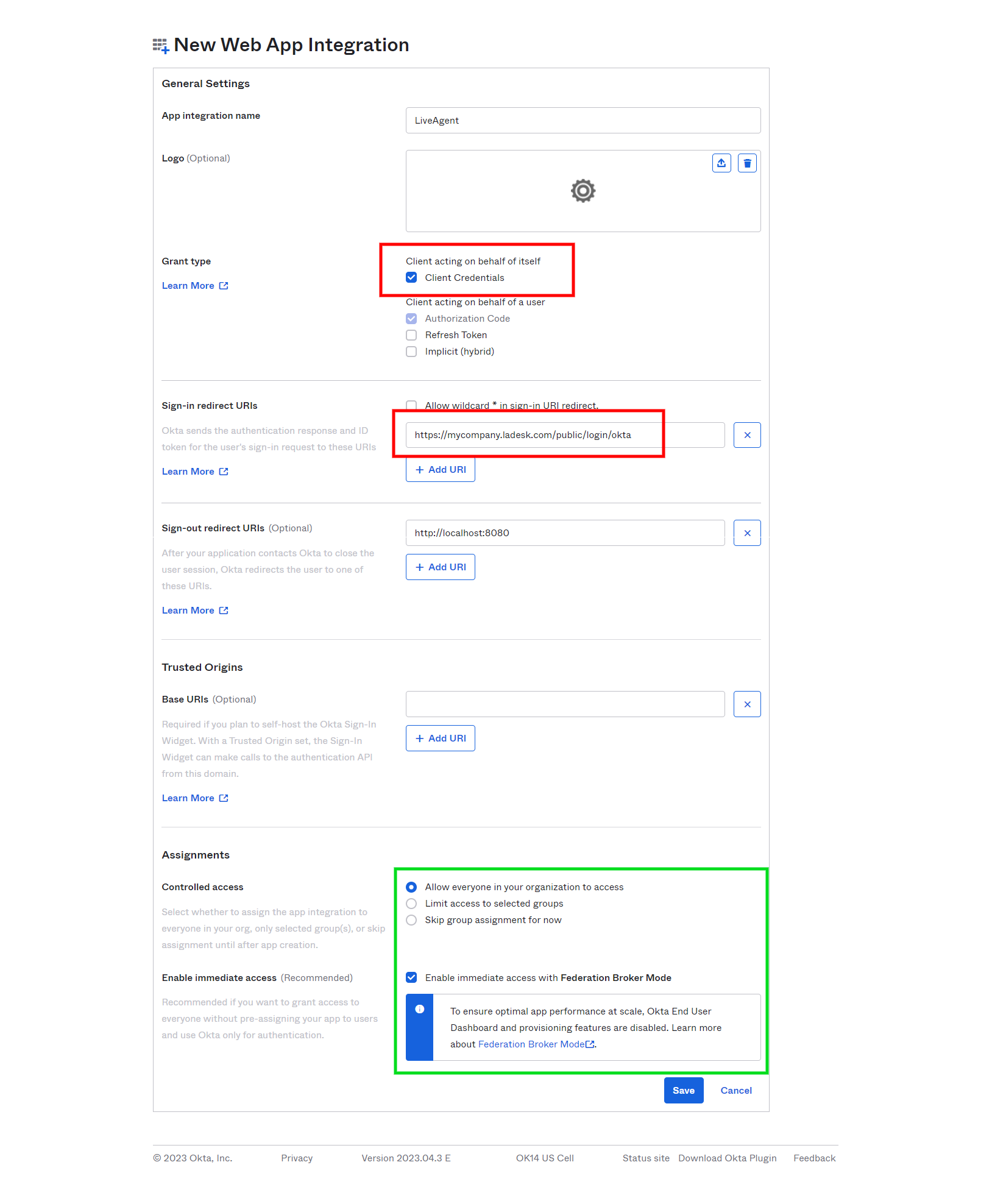 Okta管理パネルに戻り、新しいアプリの設定を続けます。アプリに名前を付け、「Grant type」セクションで「Client Credentials」オプションを選択し、LiveAgentパネルからコピーしたリダイレクトURIアドレスを「Sign-in redirect URIs」フィールドに貼り付けます。 必要に応じて、「Assignments」セクションでOktaアカウントのどのユーザーがOktaシングルサインオン方式でLiveAgentアカウントにログインできるかを設定します。