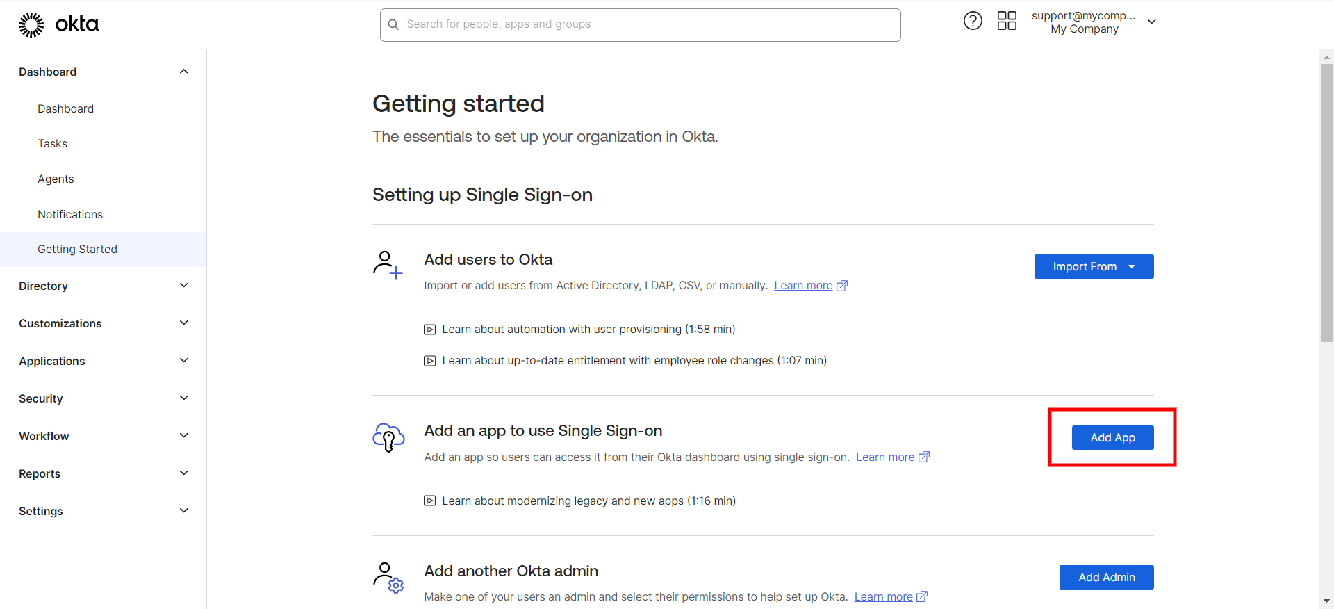OktaアカウントをLiveAgentと連携するには、https://login.okta.com/ にアクセスしてOktaアカウントにログインします。ログイン後、右上のプロフィール横にある「Admin」ボタンをクリックして管理パネルにアクセスします。管理パネルの「Getting Started」セクションから、「Add an app to use Single Sign-on」セクション内の「Add App」ボタンをクリックします。または、メニューからApplications > Applicationsに移動することもできます。