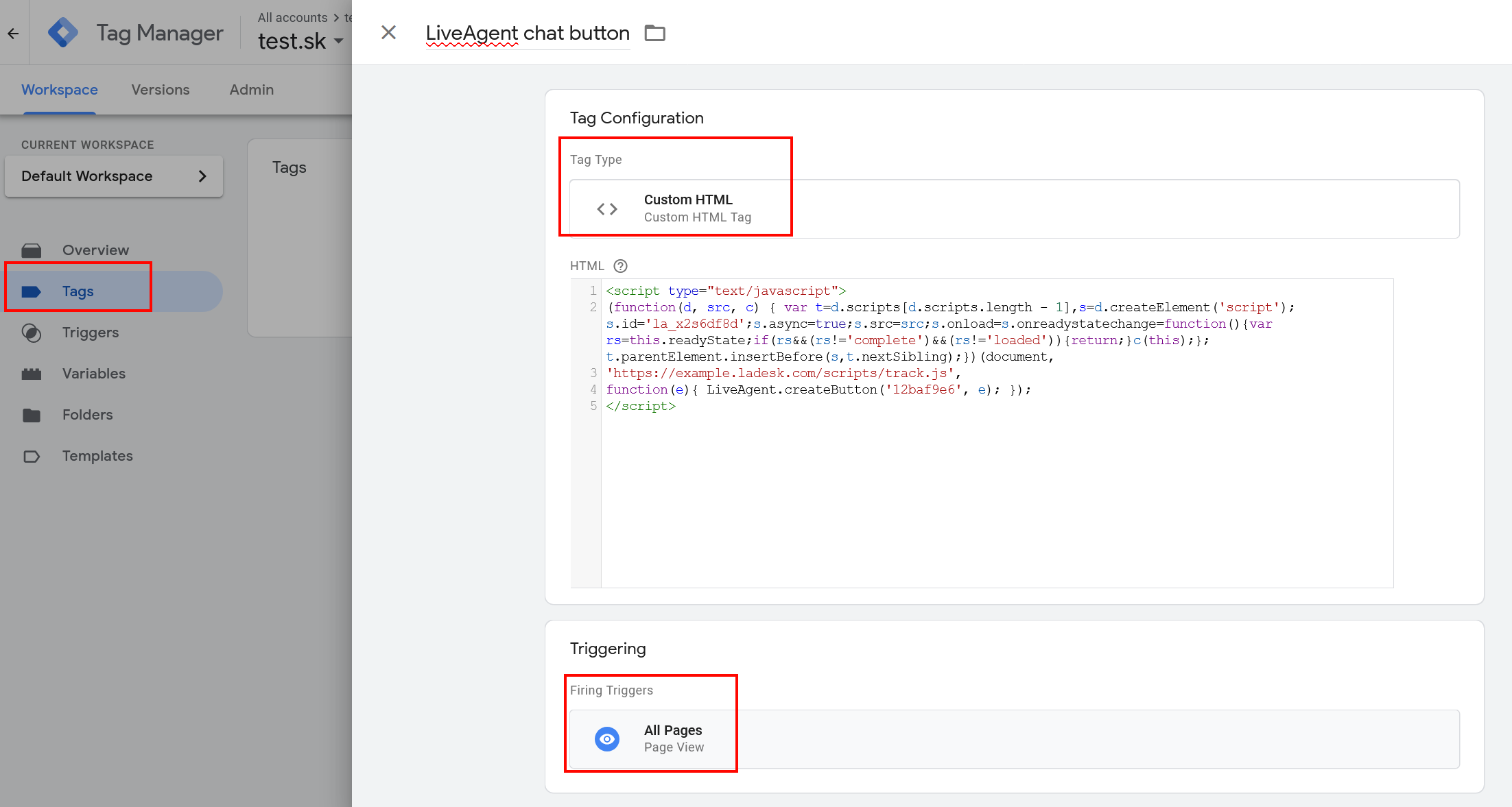 3. LiveAgentパネルからチャットボタンのスクリプトをコピーし、該当タグの「HTML field」(HTMLフィールド)に貼り付けて、Triggering(トリガー)のFiring Triggers(発火トリガー)をAll Pages(すべてのページ)に設定します。