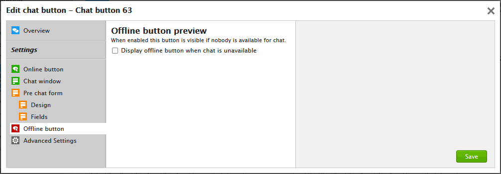 例えば、対応可能なエージェントがいる場合にチャットボタンを表示したいが、オフライン用のボタンは表示せず、代わりにナレッジベースの検索ウィジェットを表示したいとします。これを実現するには、まずチャットボタンのオフラインバリアントを表示しないよう設定する必要があります。Display offline button when chat is unavailable(チャット利用不可時にオフラインボタンを表示する)オプションのチェックを外してください。