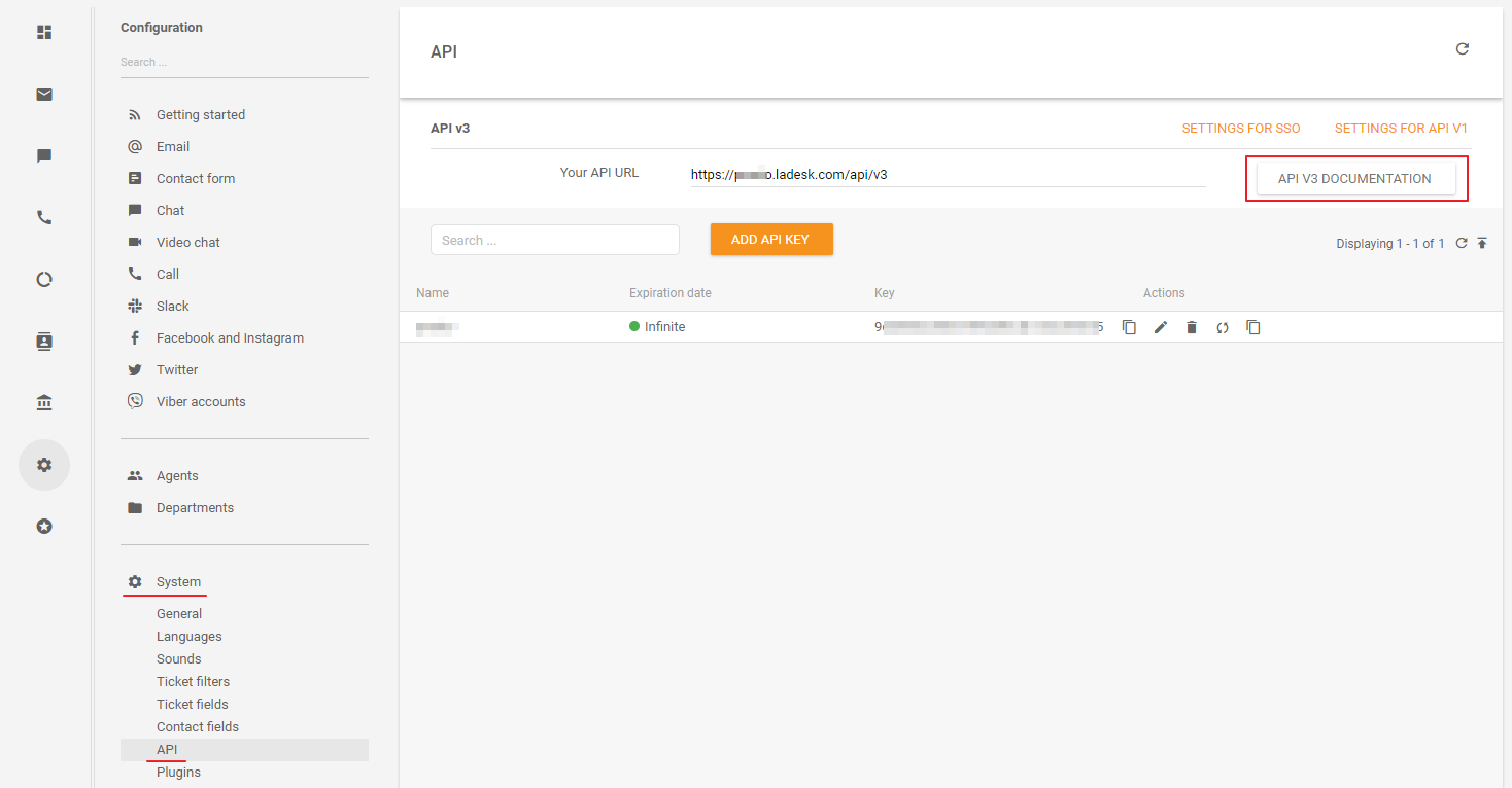 エージェントパネルから次の手順でもアクセスできます: Configuration(設定) > System(システム) > API > API V3 DOCUMENTATION