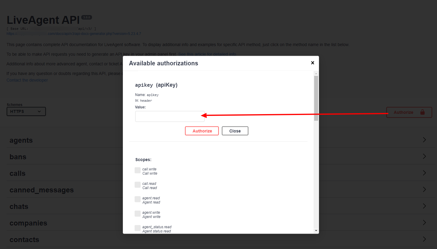 - https://**YOURDOMAIN.**ladesk.com/docs/api/v3/#/ でLiveAgent APIを認証し、APIの動作に必要なスコープを追加します: