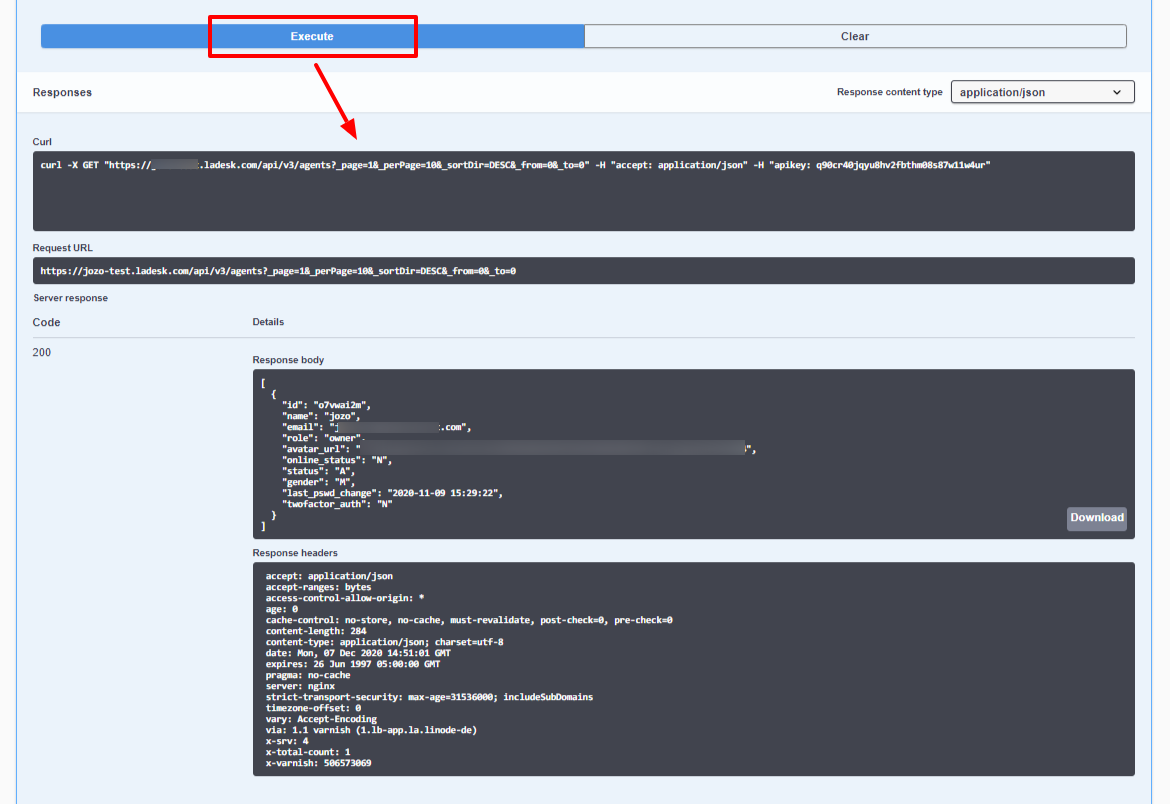 - 必須パラメーターを入力し、「execute」ボタンを押して結果を確認します