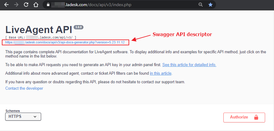 もし、お好みのプログラミング言語(例えばC#など)向けにLiveAgentのAPIライブラリ / SDKを生成する必要がある場合は、API v3ドキュメントの最上部にあるswagger(OpenAPI)APIディスクリプタを利用できます。