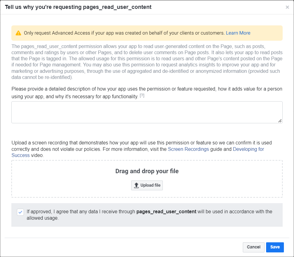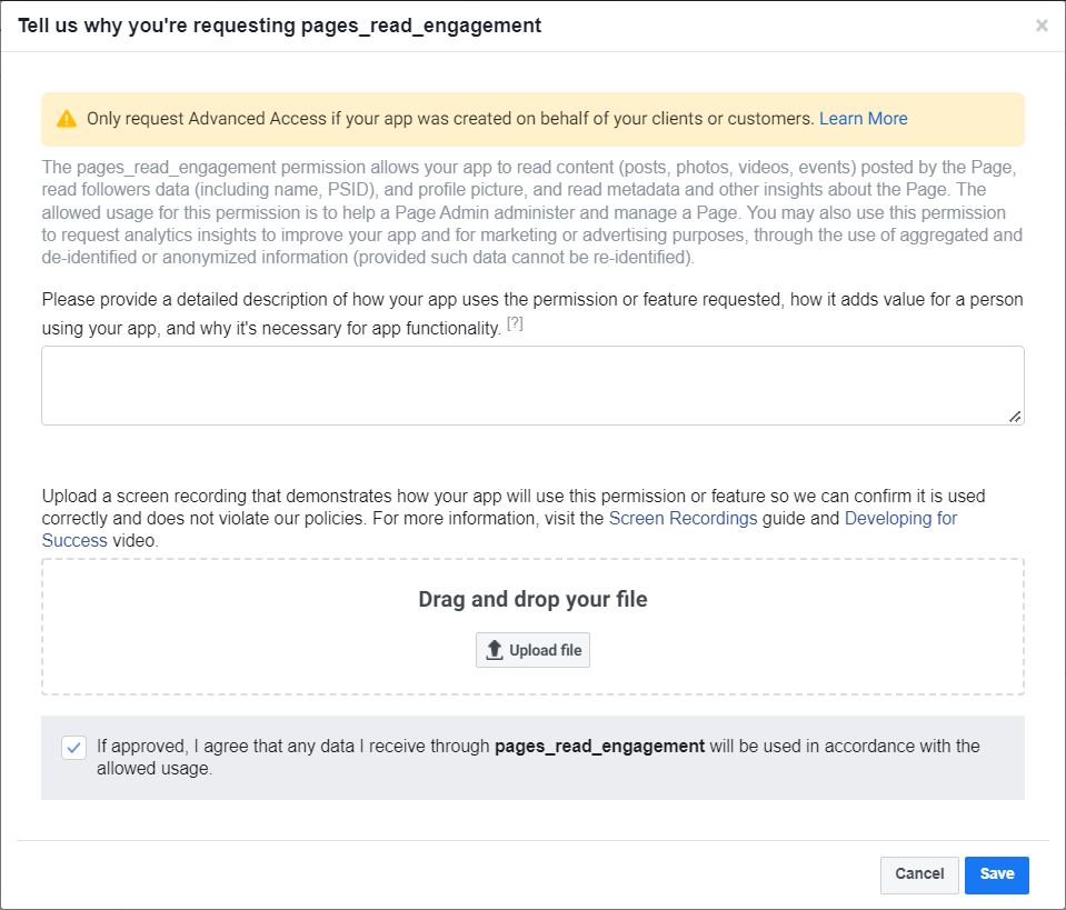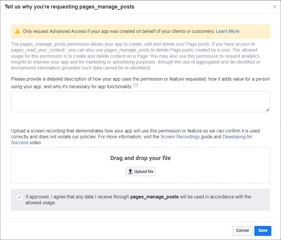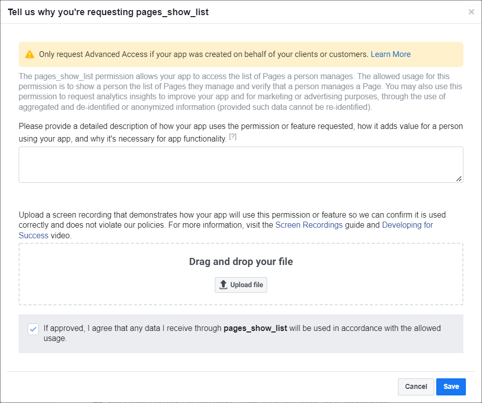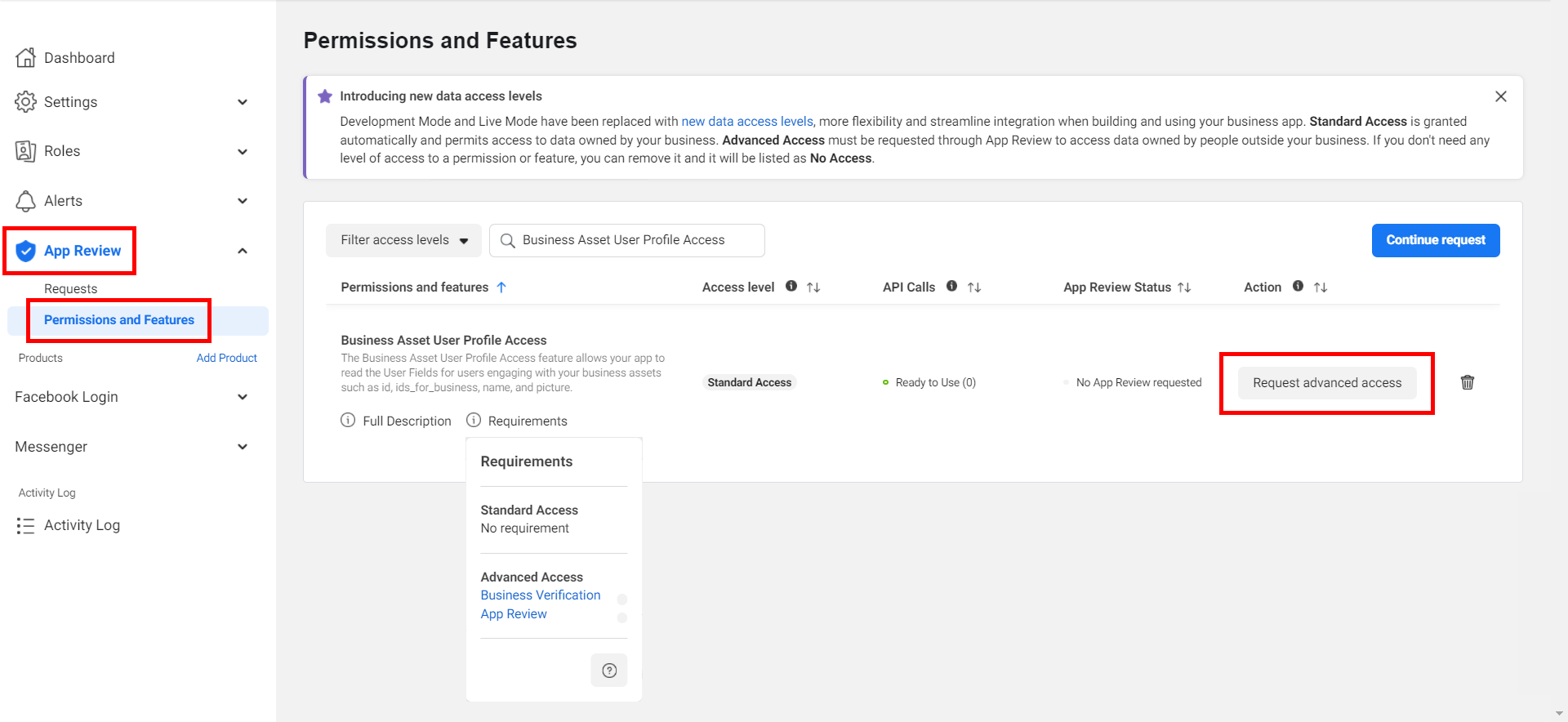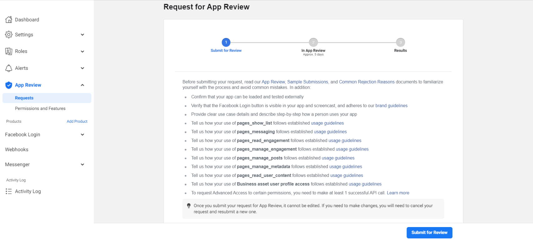 必要なすべての権限について上級アクセスをリクエストした後、メニューの “App Review > Requests” セクションに移動し、保留中のリクエストを編集してください。