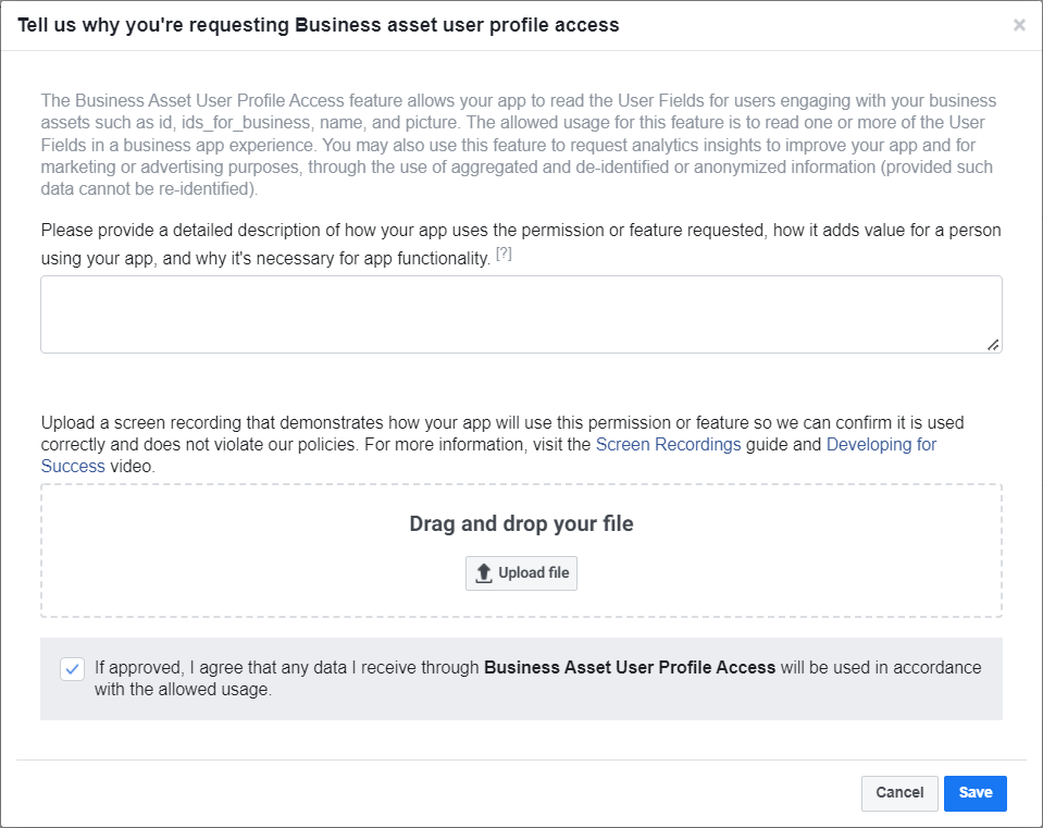 このガイドの末尾にある VIDEO_FB_LA_share-post-sub.mp4 に近い内容の動画を自分で録画し、ファイルエリアに添付してください。Facebookのレビュー担当者は、一般的な動画のみの提出を受け付けていません。