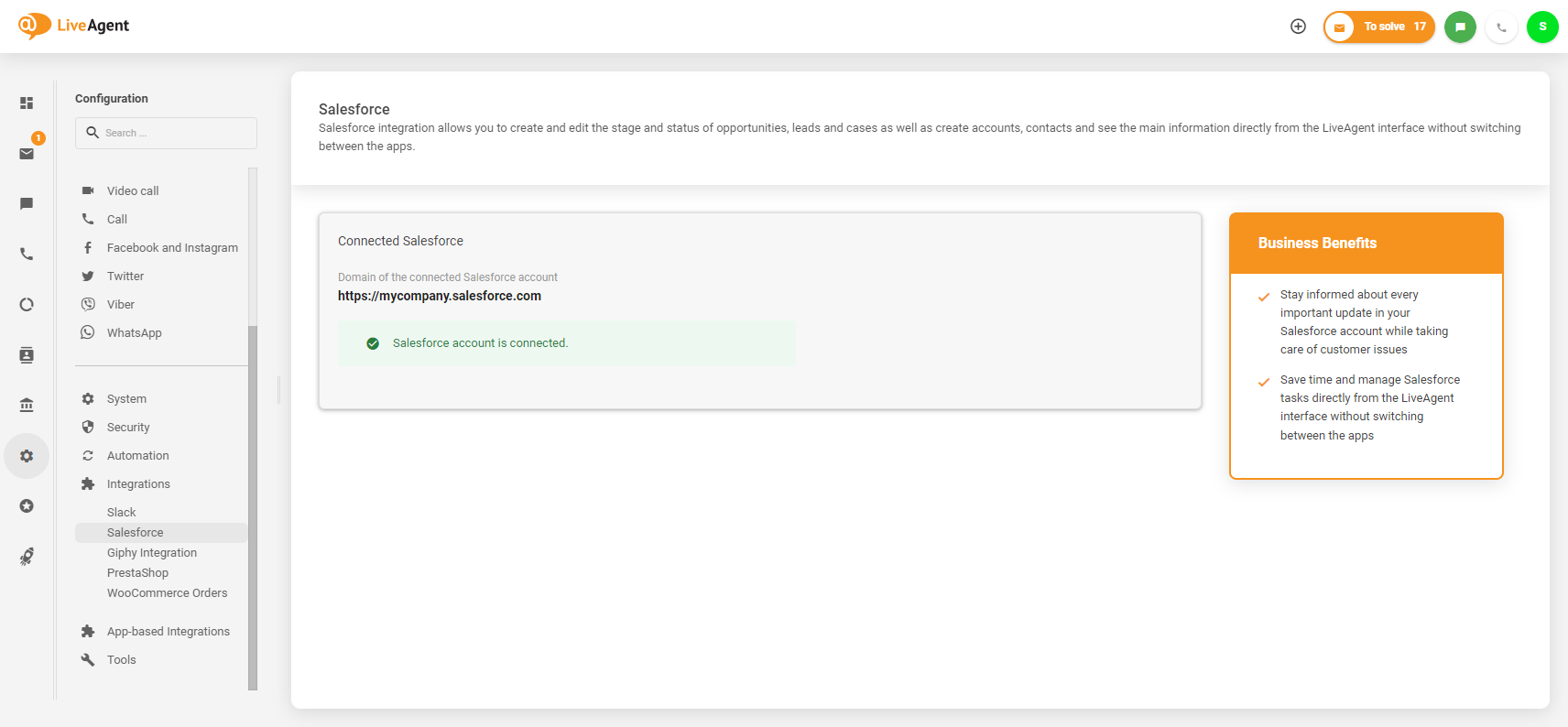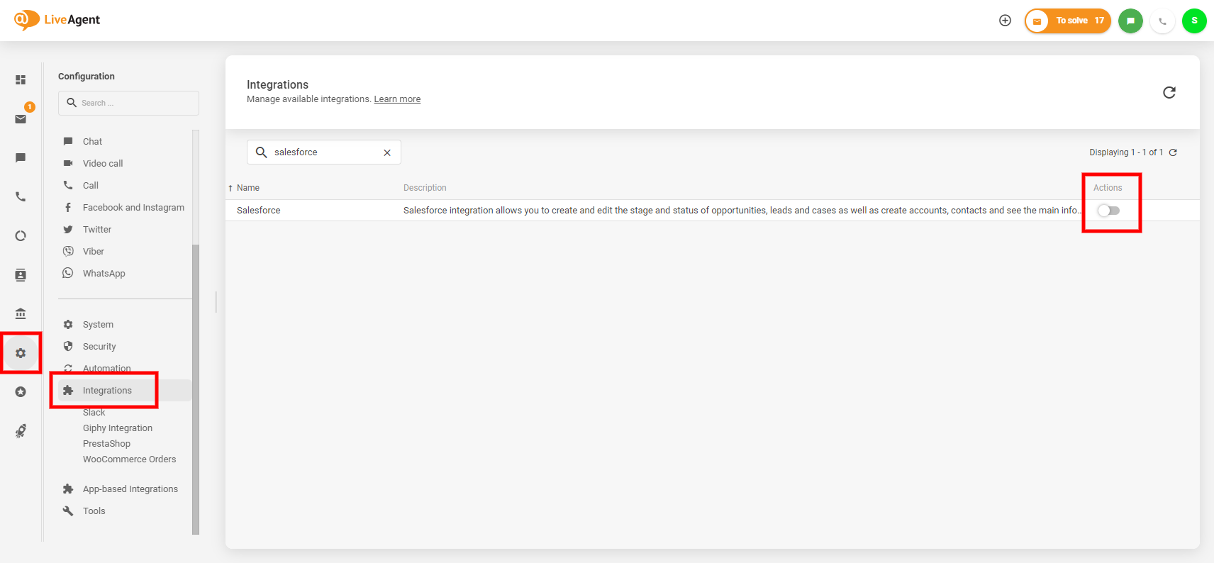 次に、Configuration(設定)> Integrations(インテグレーション)> Salesforceに移動し、“Salesforce"ボタンをクリックして、SalesforceアカウントをLiveAgentインストールと接続します。