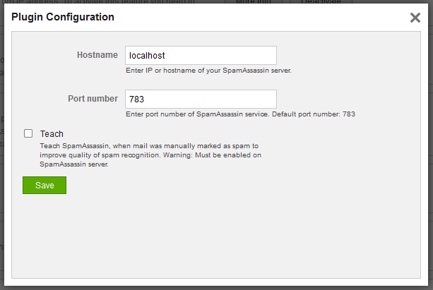 また、「Teach(学習)」にチェックを入れることもできます。スパム認識の精度を向上させるために、メールが手動でスパムとしてマークされた際にSpamAssassinに学習させることができます。注意:SpamAssassinサーバー側でも有効化されている必要があります。