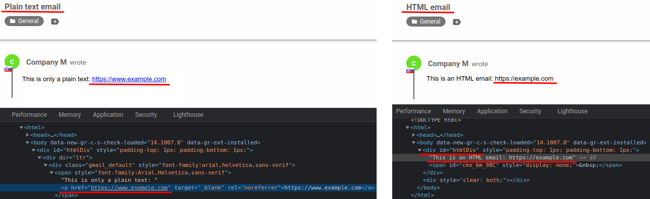 メールがプレーンテキストで送信された場合、LiveAgentはメール本文内のすべてのURLを自動的にクリック可能なリンクに変換します。