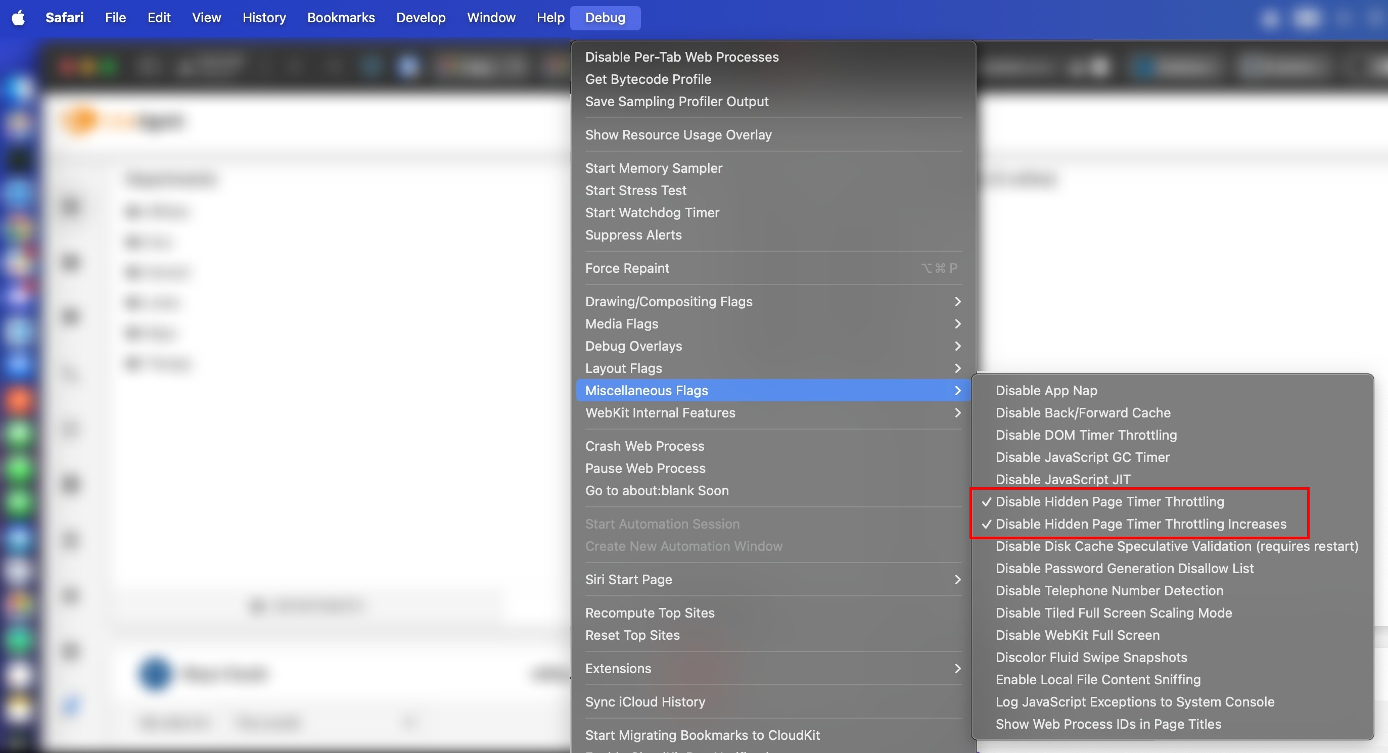 - Debug(デバッグ)> Miscellaneous flags(その他のフラグ)にある「Hidden Page Timer Throttling」および「Hidden Page Timer Throttling Increases」オプションを無効にする