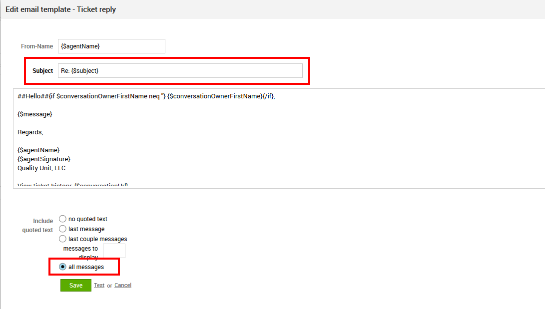 次に、subject(件名) から " - [{$conversationCode}]" の部分を削除し、テンプレート本文のフィールド下にある引用設定を、すべてのメッセージを含める設定に変更してください。最終的に以下のような状態になるよう設定します: