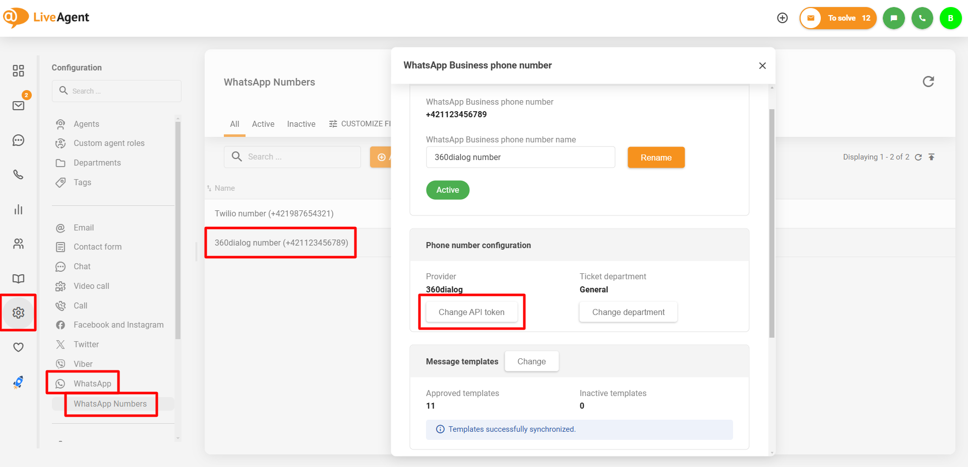 このエラーは、WhatsApp番号に有効なAPIキーが設定されていないことを意味します。360dialogパネルでAPIキーを再生成してください。“Manage WhatsApp Business account”(WhatsAppビジネスアカウントを管理)ボタンをクリックしてWhatsAppビジネス管理セクションに移動し、新しいAPIキーを生成します。その後、LiveAgentの「Configuration」(設定)> 「WhatsApp」 > 「WhatsApp numbers」(WhatsApp番号)に移動し、対象の番号をクリックして “Change API key”(APIキーを変更)ボタンをクリックし、新しいAPIキーを入力してください。