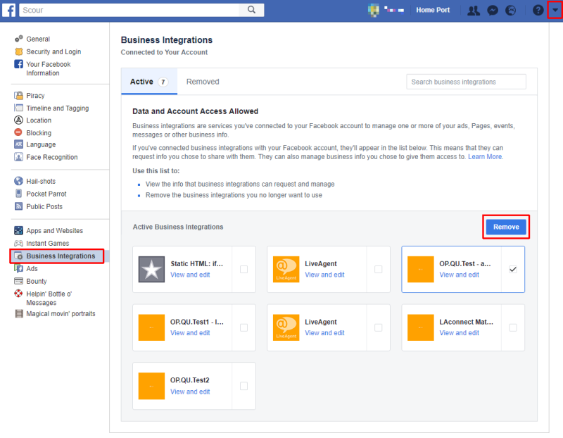 次に、LiveAgentのビジネスインテグレーション(ダウンロード版ライセンスをお持ちの場合は独自のFacebookアプリのインテグレーション)を選択し、Remove(削除)をクリックします。