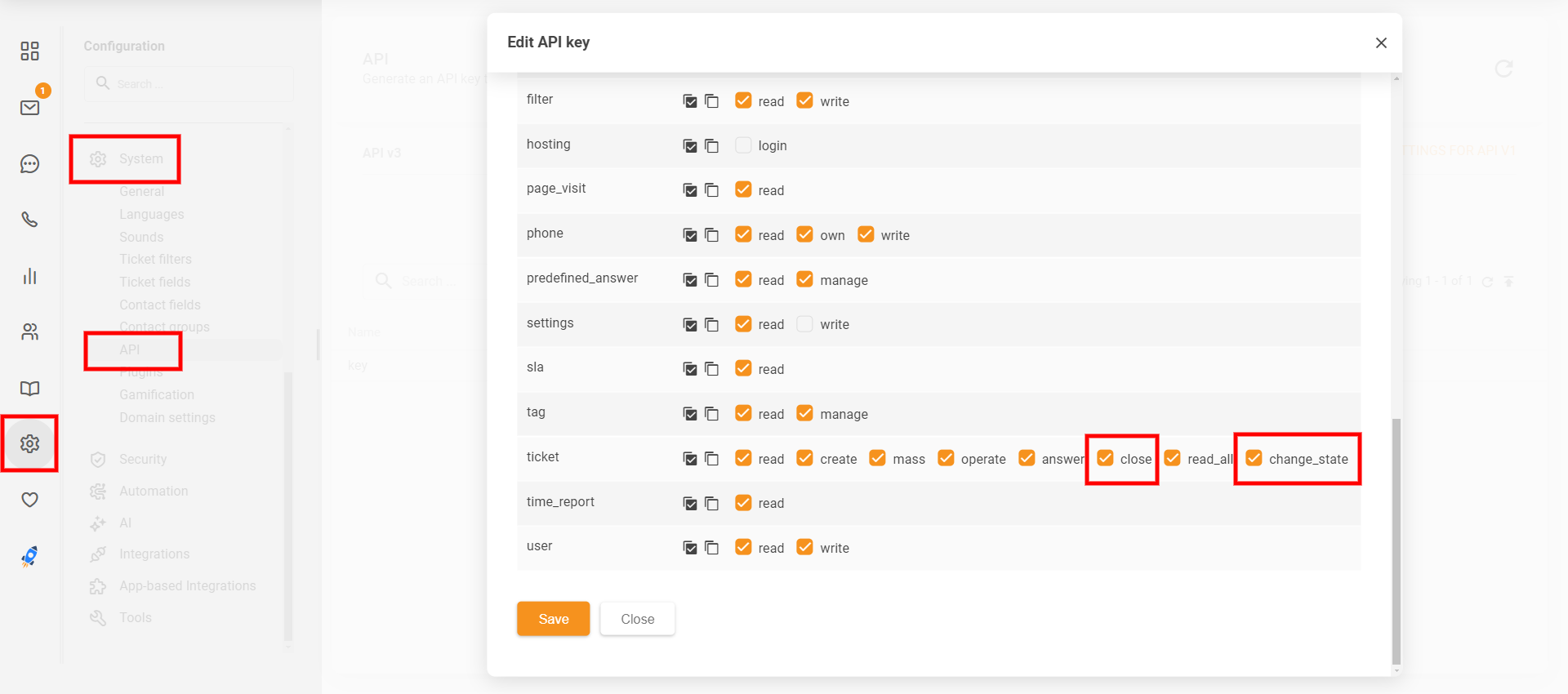 API v3を使用してチケットの作成、更新、または削除を行っている場合は、Configuration(設定)> System(システム)> API に移動し、APIキーのチケット関連の権限を更新してください。